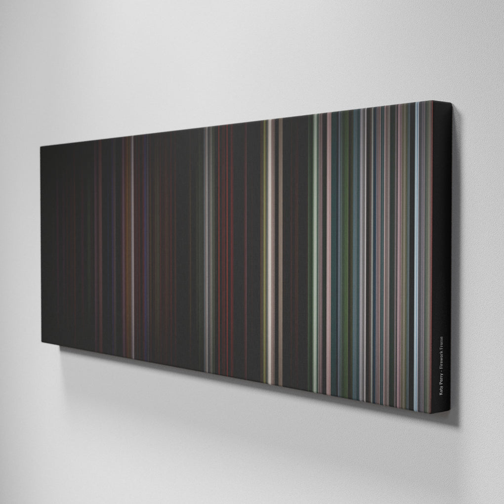 Presenting the ultimate treat for lovers of the Katy Perry - Firework song. For the first time ever, we've mapped out the entire DNA of the Katy Perry - Firework musical clip on canvas from start to finish. Every vertical stripe represents a scene from Katy Perry - Firework video, with the color taken as the average of all the frames within that scene.