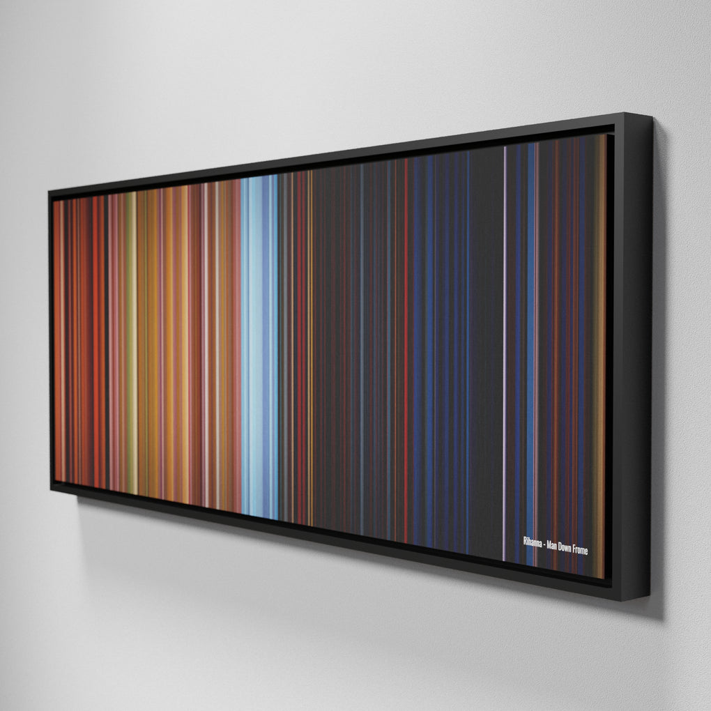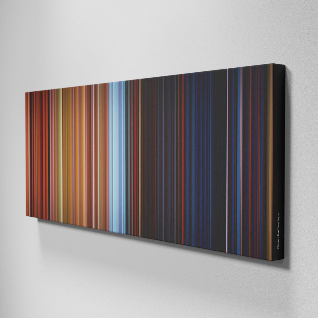Presenting the ultimate treat for lovers of the Rihanna - Man Down song. For the first time ever, we've mapped out the entire DNA of the Rihanna - Man Down musical clip on canvas from start to finish. Every vertical stripe represents a scene from Rihanna - Man Down video, with the color taken as the average of all the frames within that scene.